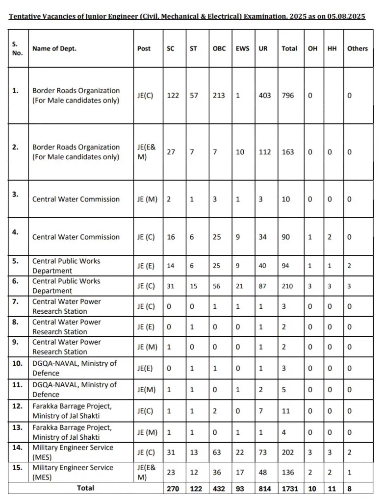 SSC JE Vacancy 2025 has been extended for Junior Engineer positions in Civil, Mechanical, and Electrical for Government of India Organizations and Offices. According to the most recent notice, there are currently 1731 openings for Junior Engineer positions, which is about the same as last year.